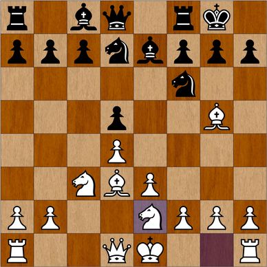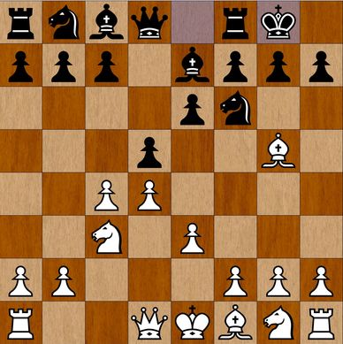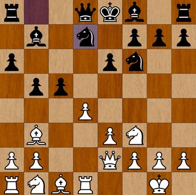Hvid er i gang med"minoritetsangrebet" på c6, hvor Sf3 kan gå til e5, hvor den gør mere nytte end hvis den var spillet til e2. Snart bliver c6-bonden et angrebsmål, fordi den ikke kan rykke frem. Sort skal søge sine chancer på kongefløjen, somme tider kan både Dronning og Te8 angribe mod g2 og h2) 8...Te8 9.0-0 Sf8 [diagram 7] sort planlægger Sf8-e6 og c7-c5. Det havde væretsikrere at ofre et tempo på at indskyde c7-c6, fordi lige her er der en kombination, som Kasparov fandt på: 10.b4! Bxb4 11.Bxf6 Qxf6 12.Nxd5 Qd6 13.Qa4 truer Te8 og Lb4, og hvid har vundet en bonde.